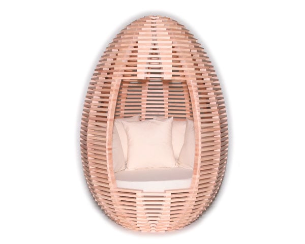 The egg pod rotates from the base by sitting in the pod and rotating left and right using your feet.